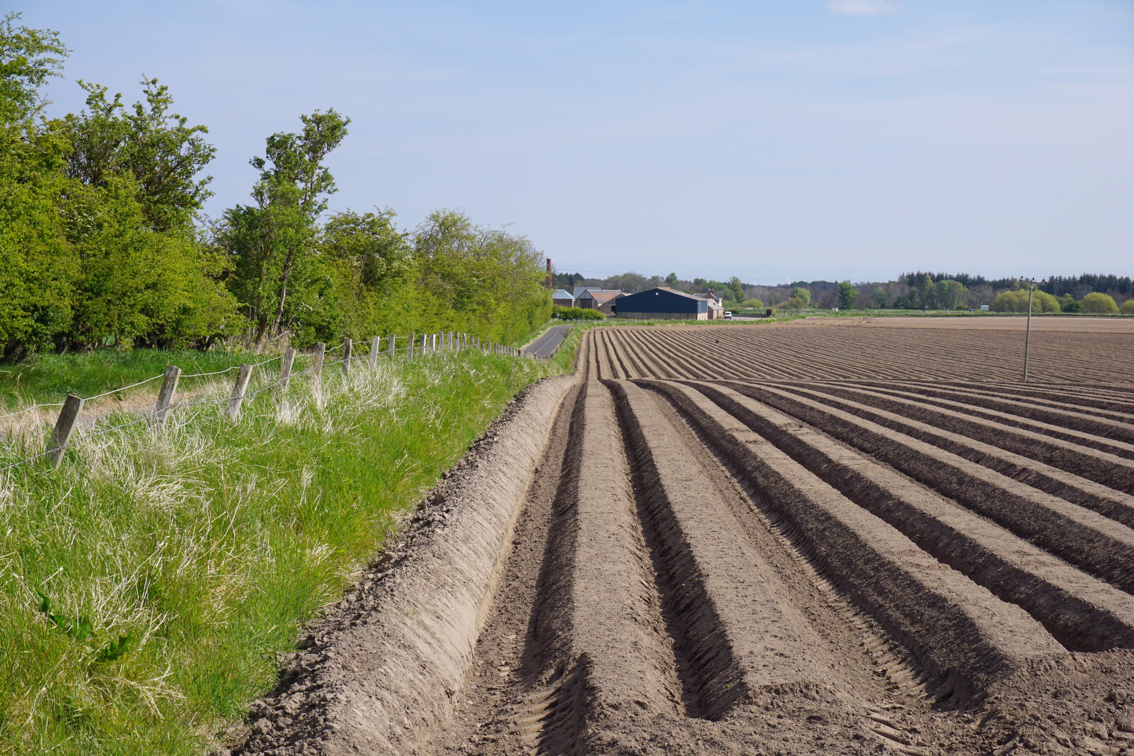 Landschaftlich ist dieses Land geprägt durch intensivem Ackerbau. Sommergerste zum Whisky brennen, aber auch ewig große Felder mit Kartoffeln. Fast jedes Feld ist mit GPS, und zwar mit einem Top Signal gesät und bearbeitet worden. Wie auch bei uns.