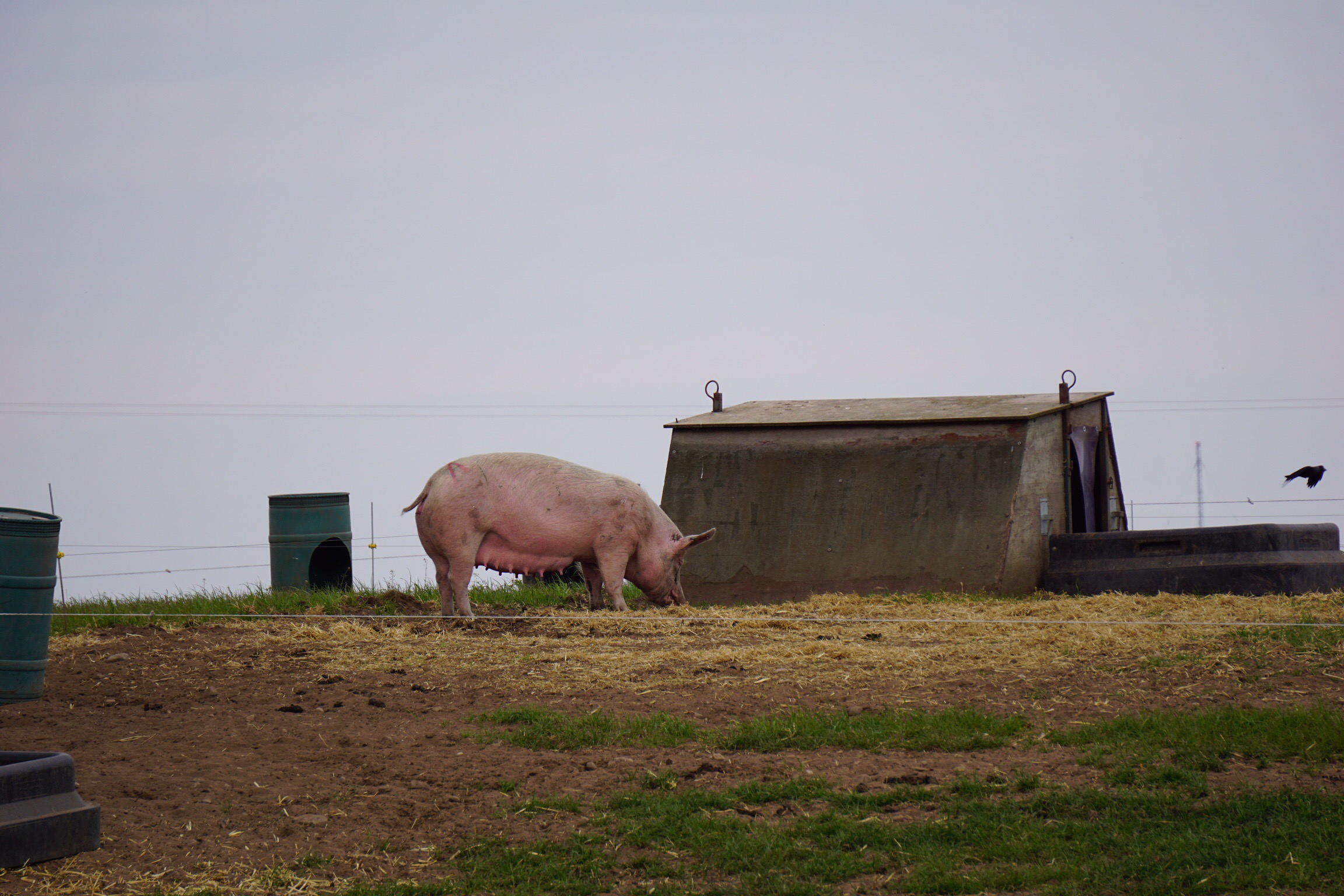 Ab und zu sieht man noch Rinder und Schafe. Diese Muttersauenhaltung im Freien habe ich so noch nie gesehen. Sieht interessant aus.