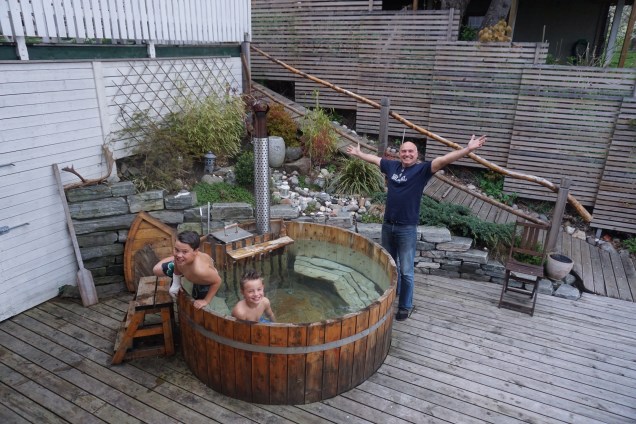 Als erstes fuhren wir auf den Fußballplatz, um einem der Jungs beim Fußballspiel zuzuschauen. Danach holten wir den Zweiten bei einem Freund ab, und dann ging es nach Hause. Stephan heizte schon am Samstag seinen Badezuber im Garten ein, damit er am Sonntag heiß ist. 2500 Liter Wasser wollen schon geheitzt werden. Das macht er ab und zu, wenn Gäste kommen, und die Zeit vorhanden ist. Wir saßen sicher 2 Stunden im Bad, und unterhielten uns über Gott und die Welt, was ihn dazu bewegt hat, nach einer Station in Schweden nach Oslo zu gehen, und das wohl für immer.