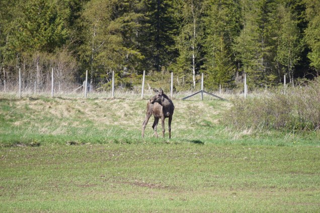 Immer wieder sah ich am Straßenrand Warnschilder vor querenden Elchen. Ich wollte schon ein Schild fotografieren, aber dann sah ich 2 Elche in einer Entfernung von 100 Meter. Sie beobachteten mich ganz genau. Wahrscheinlich haben sie noch nie einen Bayern gesehen.