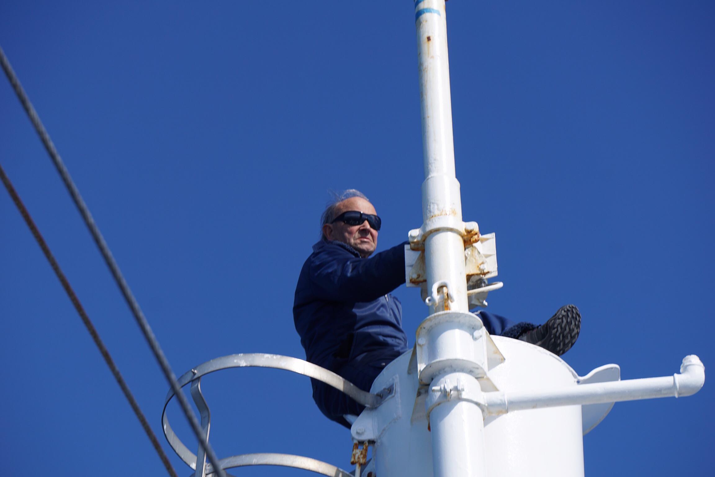 Hoch oben im Korb sitzt der 92-jährige Vater des Kapitäns