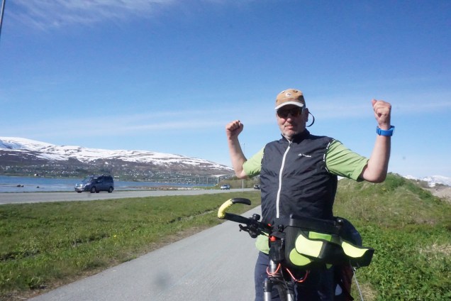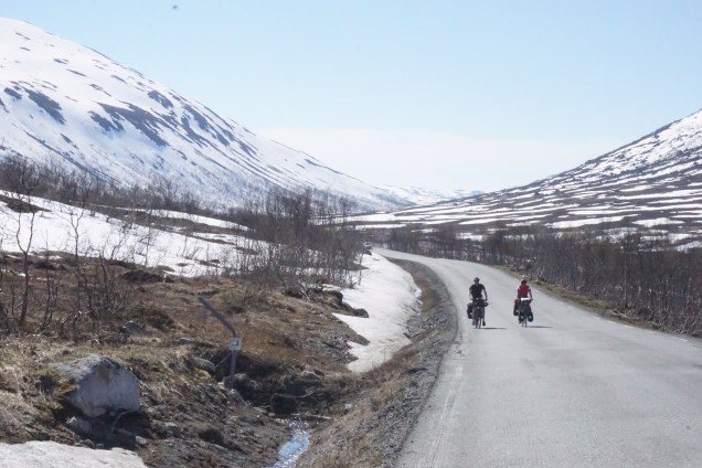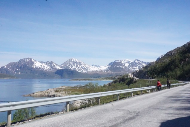 Der gestrige Tag war wie schon beschrieben in jeder Hinsicht traumhaft schön, aber auch genauso anstrengend. Das waren 80 km mit dem Rad und 40 km mit der Fähre. Heute strampelten wir wieder wie verrückt durch die Berge, an den immer noch tiefverschneiten Bergen entlang. Es ist deutlich zu erkennen, dass jetzt die Natur geradezu explodiert. Ist aber auch logisch, denn die Sonne scheint Tag und Nacht. Als wir um 08:15 Uhr starteten, hatten wir um die 16 Grad, das ist fast unglaublich, wenn man die letzten 3 Wochen betrachtet.