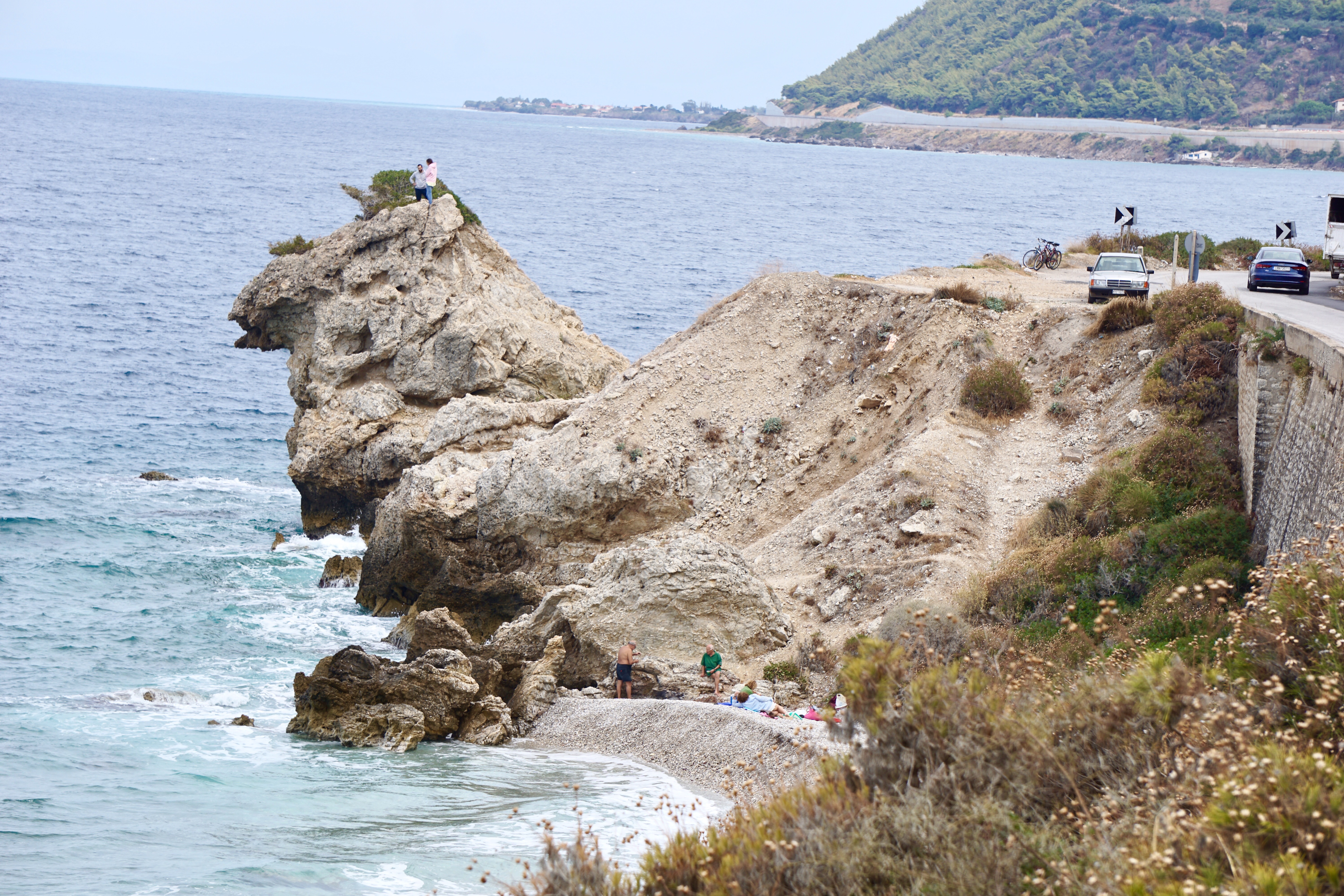 Nachdem mein Schiff am Montag Nachts in Patras erst ablegt, habe ich für diese noch verbleibenden restlichen 150 Kilometer alle Zeit der Welt. Leider habe ich mir aber ein frühes Bettgehen aber auch Aufstehen angewöhnt, sodass ich kurz nach 6 Uhr schon hellwach war. Trotzdem bin ich erst um 9 Uhr losgefahren. Dummerweise fing es kurz danach zu regnen an, sodass ich mir in einer Bar einen Cappuccino zu Überbrückung genehmigte. Nach einer halben Stunde war der Spuk vorbei. Dann ging’s weiter, und jetzt wurde ich erst richtig nass. Es begann nämlich wieder leicht zu regnen. Das Spritzwasser des Hinterrades weichte dann selbst den Rest meines Haupthaars ein, mangels Schutzblech natürlich. Den ganzen Tag ging es an der Küste entlang, von einem Fischerdorf ins andere. Die Gegend scheint nahezu ausgestorben zu sein, der Rest der hier verbleibenden Menschen ist dabei alles einzuwintern. Ich möchte sagen, das sieht zum Teil trostlos aus. Unterwegs traf ich dann ein Pärchen, Mario aus Argentinien und Fanny aus Frankreich mit ihrer 2 Jahre alten Tochter. Beide fahren mit Anhänger, Mario mit der Tochter und Fanny mit dem Gepäck. Seit Juli sind sie schon unterwegs um die Welt kennen zu lernen. Er fragte mich, was ich davon halten würde, wenn sie mit den Fahrrädern durch Tunesien, Algerien dann nach Marokko fahren würden, ob das gefährlich sei. Nun, ich kann das natürlich nicht beantworten, ich jedenfalls, ja ich kann mir vorstellen, das zu riskieren. Ohne Selbstvertrauen scheitert man doch mit absoluter Sicherheit, mit zuviel allerdings auch, dann eher menschlich.
