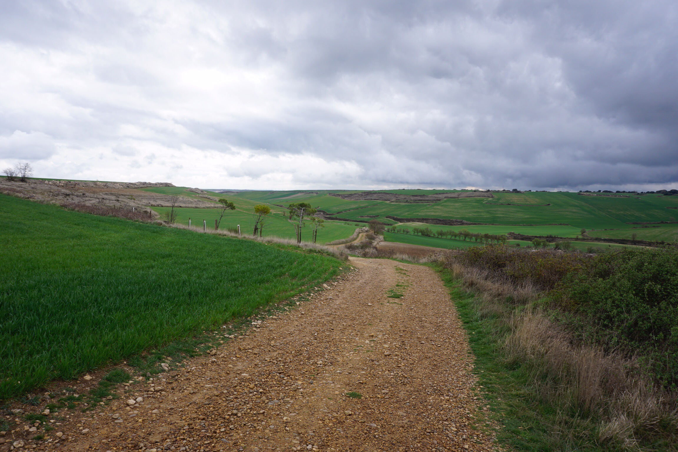 Als ich heute um 8 Uhr wach wurde – da wird es hier gerade hell – kam ein derartiger Platzregen, dass ich noch liegen blieb, und erst um viertel nach Zehn startete. Von Castrojeriz durch die bergige Meseta, ausschließlich auf Feldwegen. Ich bin jetzt zum 3. Mal hier, und das nicht umsonst. Ich liebe diese Landschaft!