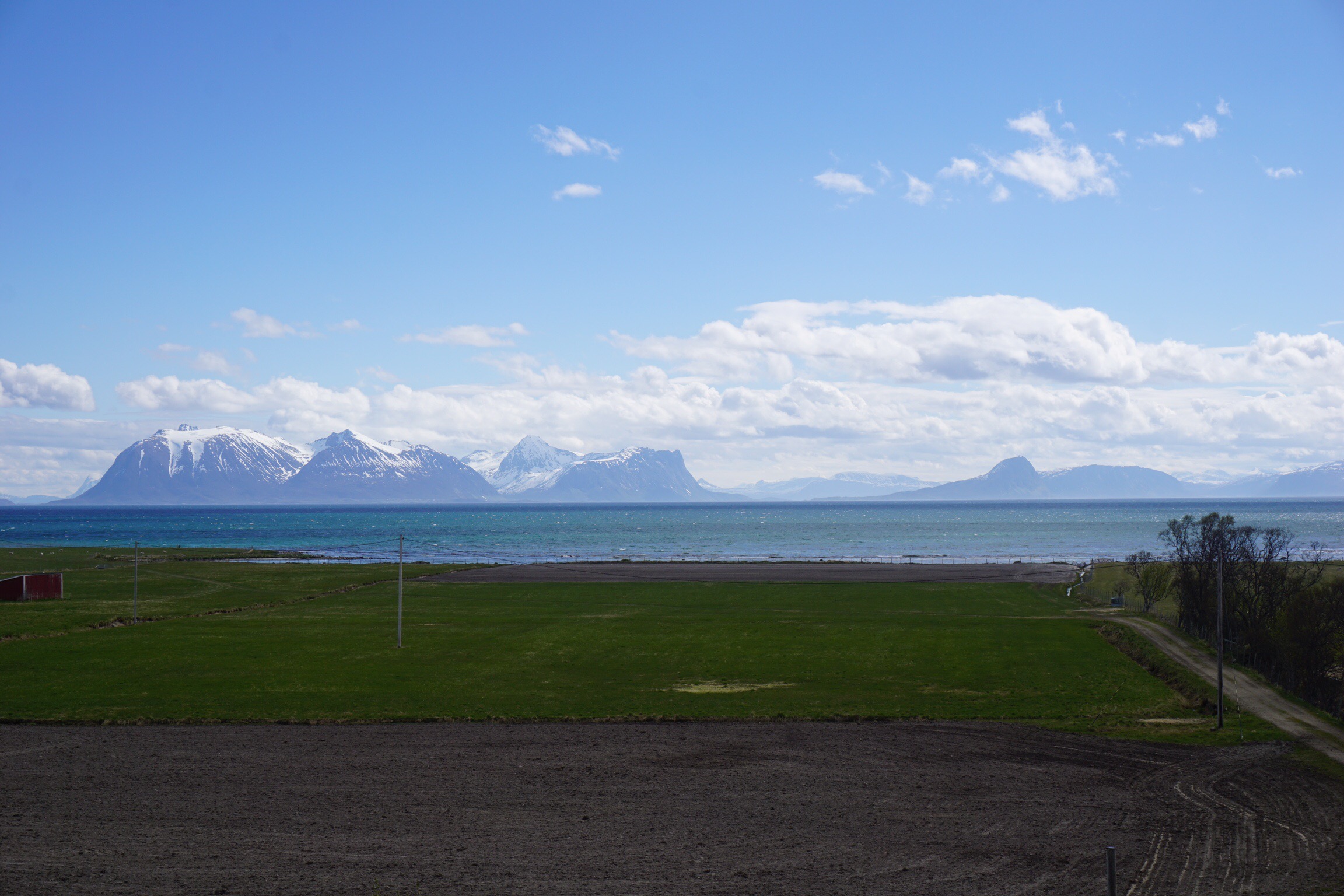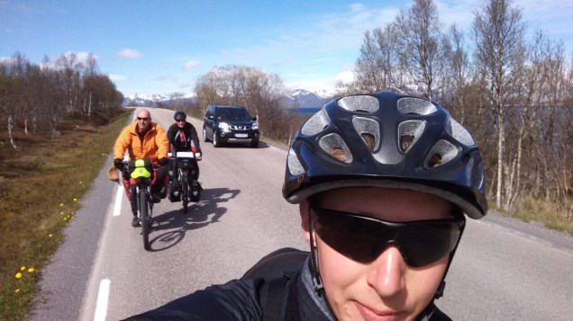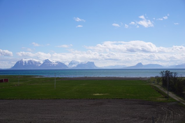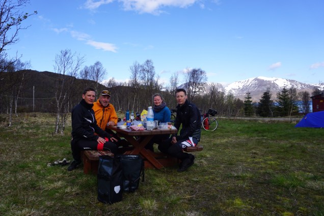 Der gestrige Tag war wie schon beschrieben in jeder Hinsicht traumhaft schön, aber auch genauso anstrengend. Das waren 80 km mit dem Rad und 40 km mit der Fähre. Heute strampelten wir wieder wie verrückt durch die Berge, an den immer noch tiefverschneiten Bergen entlang. Es ist deutlich zu erkennen, dass jetzt die Natur geradezu explodiert. Ist aber auch logisch, denn die Sonne scheint Tag und Nacht. Als wir um 08:15 Uhr starteten, hatten wir um die 16 Grad, das ist fast unglaublich, wenn man die letzten 3 Wochen betrachtet.